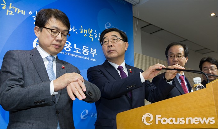 (세종=포커스뉴스) 이기권 고용노동부장관이 22일 오후 세종시 정부세종청사 보건복지부 브리핑룸에서 '일반 해고' 및 '취업규칙 변경요건 완화' 등 양대 지침에 대한 최종안 발표를 앞두고 시간을 확인 하고 있다.