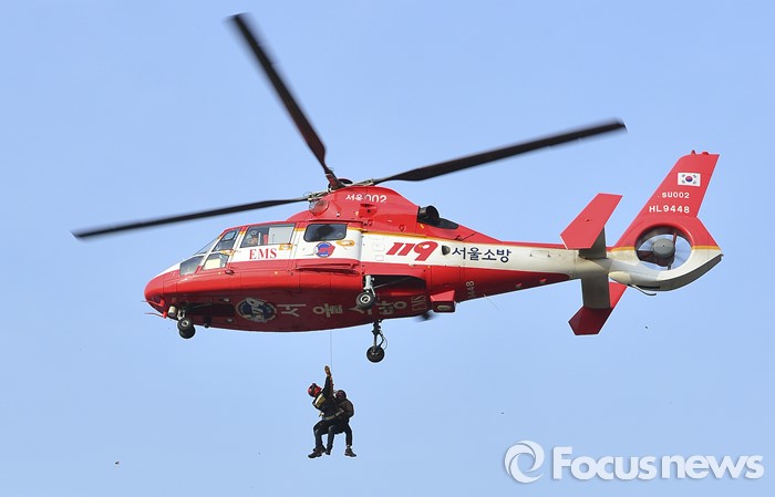 | △ 헬기로 시민 구조하는 소방대원들 |