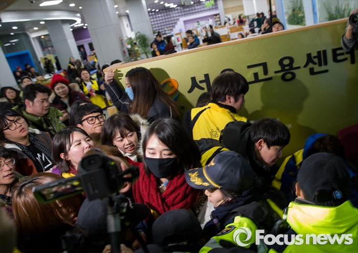 (서울=포커스뉴스) 22일 오후 서울 중구 서울고용노동청을 민원실을 점거한 알바노조원들이 경찰과 충돌하고 있다. 알바노조 조합원 100여명은 근로감독관 일처리 개선을 촉구하며 노동청을 기습 점거했다.