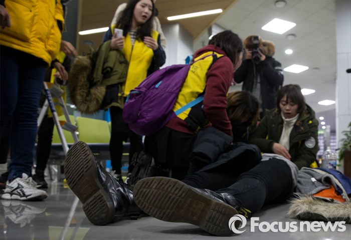 (서울=포커스뉴스) 22일 오후 서울 중구 서울고용노동청을 민원실을 점거한 알바노조원들이 경찰과 충돌, 한 노조원이 정신을 잃고 쓰러져고 있다. 알바노조 조합원 100여명은 근로감독관 일처리 개선을 촉구하며 노동청을 기습 점거했다.