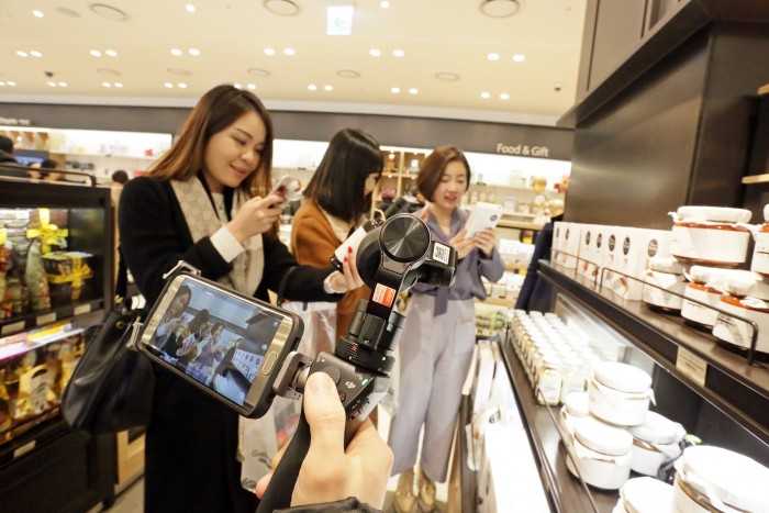 안현아 한화갤러리아 면세사업본부 IMC 팀장은 “기존의 파워 블로거를 초청해 벌이는 단순 바이럴 마케팅을 넘어서 동영상 콘텐츠로 생생한 현장의 모습을 전하는 파워 크리에이터를 활용해 중국 내에 갤러리아면세점 63의 인지도를 높이기 위해 이번 행사를 기획했다”라고 말했다.1월22일 갤러리아면세점 63을 방문한 중국 파워 크리에이터들이 고메이494 코너에서 상품소개 관련 동영상 콘텐츠를 제작하고 있다. (왼쪽부터)리위리엔, 쪼우류어슈에, 쪼우천씨.<사진제공=한화갤러리아>