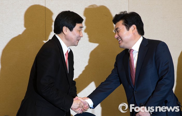 (서울=포커스뉴스) 새누리당 원유철(오른쪽), 더불어민주당 이종걸 원내대표가 24일 오후 서울 여의도 국회 귀빈식당에서 선거구획정안과 쟁정법안을 처리하기 위한 회동에 참석, 악수를 하고 있다.