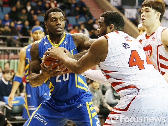 (서울=포커스뉴스) 24일 서울 잠실실내체육관에서 열린 2015-2016 프로농구 삼성-오리온 경기에서 오리온 제스퍼 존슨이 삼성 라틀리프의 볼을 가로채려 잡고 있다.