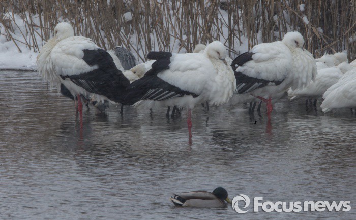 (서산=포커스뉴스)한파특보가 계속되고 있는 25일 오전 충남 천수만 해미천에 한반도에서 월동 중이던 국제보호조 황새(천연기념물199호)들이깃털을 부풀려 따듯한 공기로 몸을 보호하면서강추위를 피하고 있다.