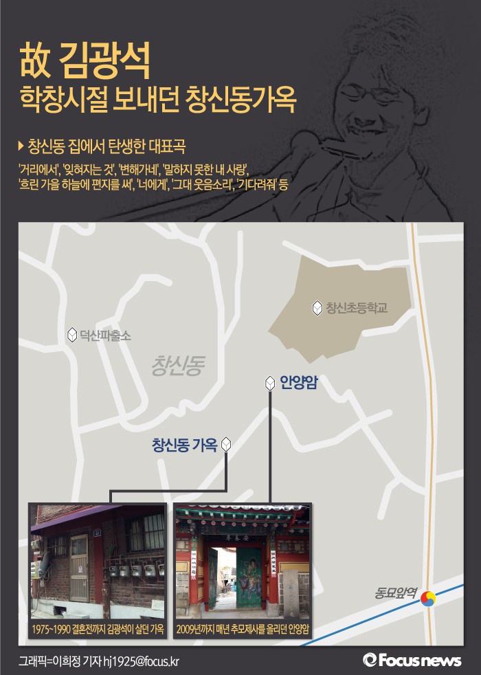 (서울=포커스뉴스) 김광석은 대구에서의 짧은 유년시절 후 1990년 결혼전까지 서울 창신동에서 거주했다. 대표곡 '거리에서', '잊혀지는 것', '변해가네', '말하지 못한 내 사랑', '흐린 가을 하늘에 편지를 써', '너에게', '그대 웃음소리', '기다려줘' 등은 김광석이 창신동 가옥에 살던 당시 탄생한 곡들이다.