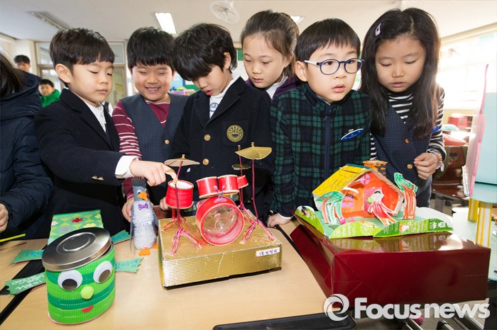 (청주=포커스뉴스) 한파가 이어진 가운데 25일 오전 충북 청주 대성초등학교가 개학식을 갖고 학사일정에 들어갔다. 1학년 학생들이 방학동안 침구들이 만든 과제물을 보고 있다.