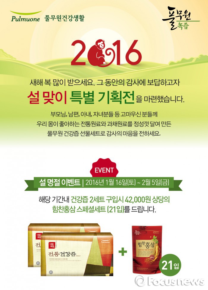(서울=포커스뉴스) 풀무원건강생활의 브랜드 풀무원녹즙과 그린체는 설을 맞아 건강기능식품 특별기획전을 연다고 25일 밝혔다.