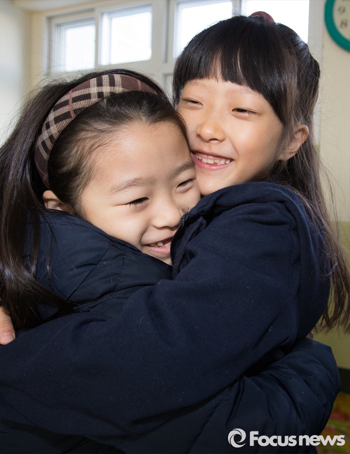 (청주=포커스뉴스) 한파가 이어진 가운데 25일 오전 충북 청주 대성초등학교가 개학식을 갖고 학사일정에 들어갔다. 1학년 학생이 포옹을 하고 있다.