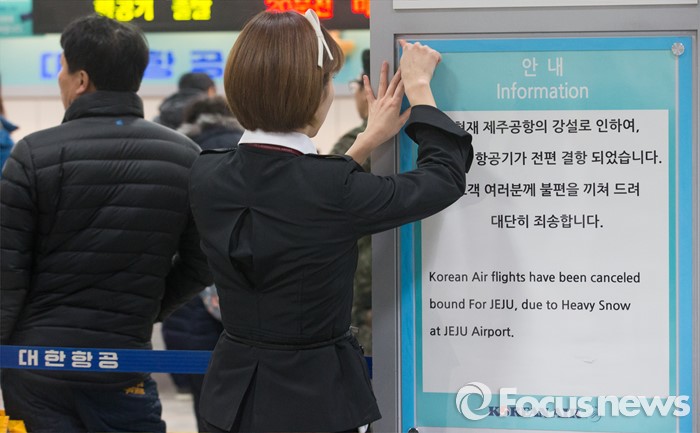 (서울=포커스뉴스) 25일 오전 서울 김포공항 국내선 청사에서 항공사 관계자가 제주와 김포로 오가는 항공편의 결항 안내문을 게시하고 있다.