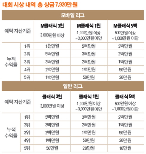 이번 대회는 ‘모바일 리그’와 ‘일반 리그’ 등의 누적수익률을 겨룰 예정이다. 모바일 리그와 일반 리그는 예탁 자산에 따라 M클래식3천(예탁자산 기준 3천만 원 이상), M클래식 1천(예탁자산 기준 1천만 원 이상, M클래식 5백(예탁자산 기준 5백만 원 이상) 등 총 6개 부문으로 나뉜다. 1위부터 5위까지 누적수익률에 따라 총 7920만원의 상금이 주어진다.