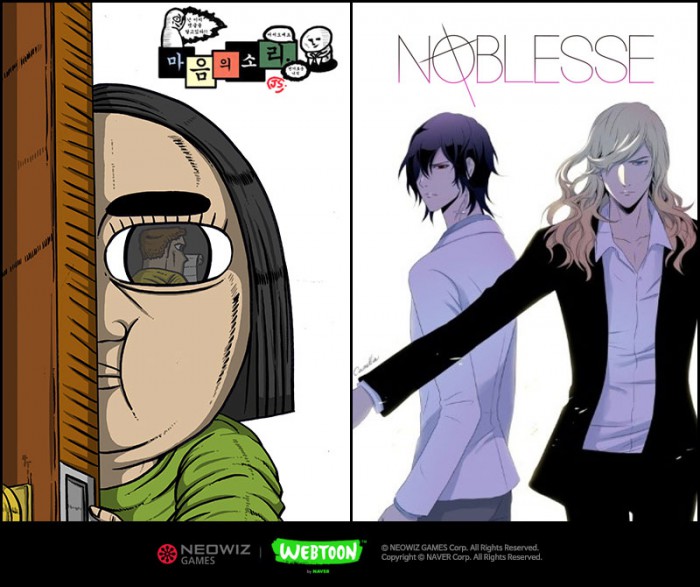 마음의 소리는 조석 작가가 2006년 9월부터 연재를 시작한 네이버 웹툰 내 최장수 인기 웹툰으로 최근 1000회를 돌파했다. 등장 인물의 일상을 특유의 개그코드로 녹여내며 큰 인기를 얻고 있는 작품이다. 네오위즈게임즈가 올 3월 국내 서비스를 목표로 개발중인 마음의 소리도 조석, 애봉이 등 웹툰 내 인기 캐릭터가 모두 등장해 게임의 재미를 한층 높일 예정이다. 노블레스는 820년만에 세상에 깨어난 주인공을 주축으로 뱀파이어와 인간 조직 간의 대립을 주요 스토리로 다루고 있는 만큼, 3D 역할수행게임(RPG)으로 재탄생 될 예정이다.
