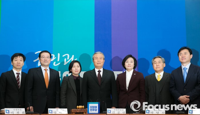 (서울=포커스뉴스) 25일 오전 서울 여의도 국회에서 열린 더불어민주당 1차 중앙선거대책위원회의에 참석한 김종인 위원장과 위원들이 취재진을 향해 포즈를 취하고 있다. 왼쪽부터 김병관, 이용섭, 양향자 선대위원, 김 위원장, 박영선, 우윤근, 김영춘 선대위원.