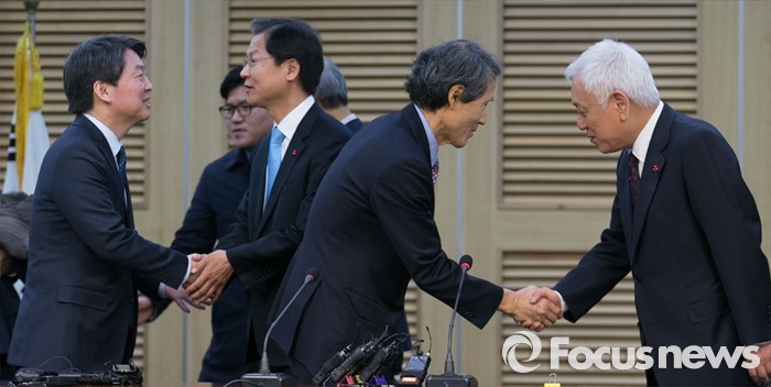 (서울=포커스뉴스) 25일 오전 서울 여의도 국회 의원회관에서 국민의당-국민회의 통합발표 기자회견을 마친 뒤 안철수(왼쪽부터) 국민의당 인재영입위원장과 천정배 국민회의 창당준비위원장, 한상진 국민의당 공동창당준비위원장과 김한길 상임부위원장이 악수하고 있다.