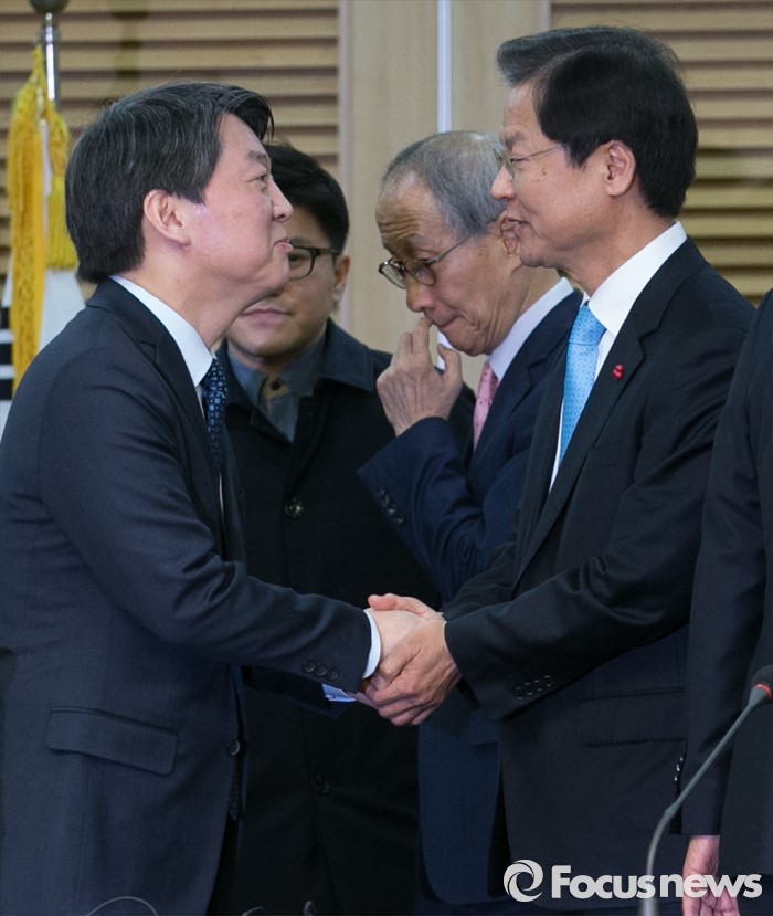 (서울=포커스뉴스) 25일 오전 서울 여의도 국회 의원회관에서 국민의당-국민회의 통합발표 기자회견을 마친 뒤 안철수(왼쪽) 국민의당 인재영입위원장과 천정배(오른쪽) 국민회의 창당준비위원장이 악수하고 있다. 가운데는 윤여준 국민의당 공동창당준비위원장.