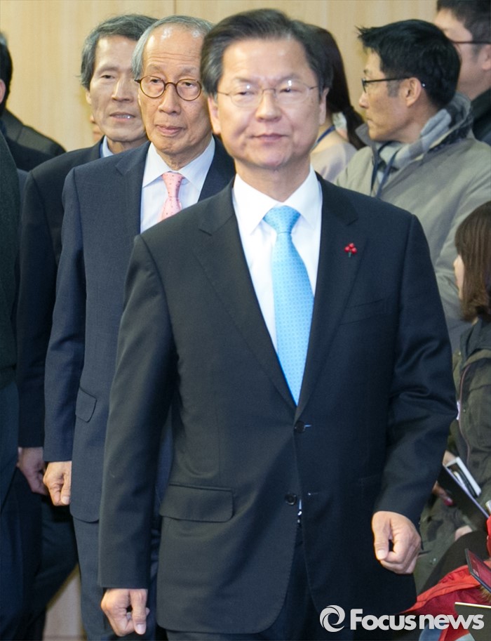 (서울=포커스뉴스) 25일 오전 서울 여의도 국회 의원회관에서 열린 국민의당-국민회의 통합발표 기자회견에 천정배(오른쪽부터) 국민회의 창당준비위원장, 윤여준, 한상진 국민의당 공동창당준비위원장이 참석하고 있다.