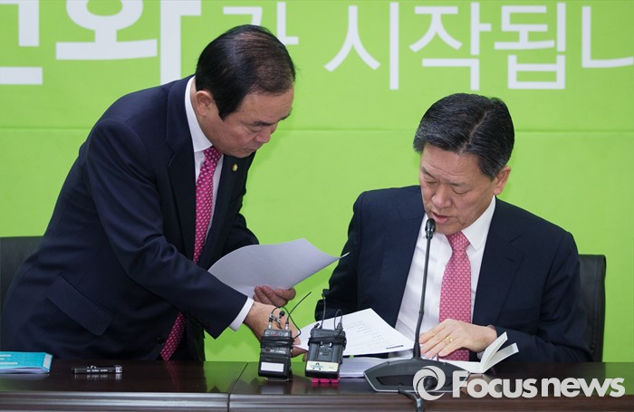 (서울=포커스뉴스)장병완 국민의당(가칭) 창당준비위원회 정책위의장과 주승용 원내대표가 25일 오전 서울 마포구 국민의당 당사에서 전체 기조회의 결과 브리핑을 준비하고 있다.
