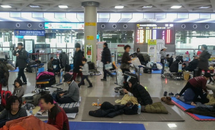 (서울=포커스뉴스) 32년 만에 폭설로 제주국제공항이 폐쇄된지 3일째 되는 25일 오전 제주국제공항 대합실에 모인 관광객들이 운항 재개를 기다리며 바닥에 앉아 있다.