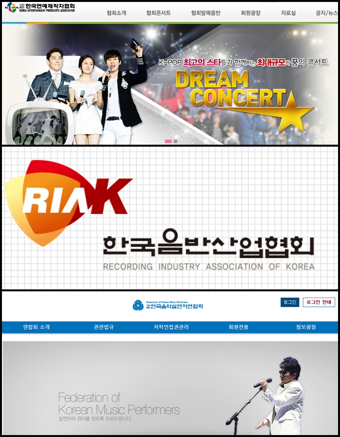 연이어 다음달 29일 (사)한국음악실연자연합회(음실연) 회장 선거가 연이어 열린다. 음실연은 가수와 음반 반주자들의 저작인접권을 신탁 관리하는 저작권단체다. 회장 입후보자 등록받고 있다.지난 21일 한국연예제작자협회 회장 선거를 시작으로 오는 27일 (사)한국음반산업협회, 다음달 29일 (사)한국음악실연자연합회가 연이어 회장 선거를 진행한다.<사진출처=한국연예제작자협회, (사)한국음반산업협회, (사)한국음악실연자연합회 홈페이지 캡처(위로부터)>