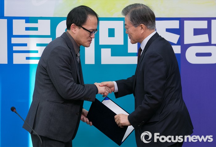 (서울=포커스뉴스) 문재인(오른쪽) 더불어민주당 대표가 25일 오후 서울 여의도 국회에서 열린 인재영입 기자회견에 참석해 세월호 유가족 법률 대리인 등으로 활약한 박주민 전 민변 사무처장으로부터 입당원서를 전달받고 있다.