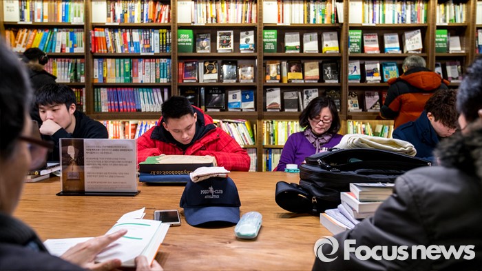 (서울=포커스뉴스) 서울 한 낮 기온이 영하권에 머물며 연일 강추위가 이어지고 있는 25일 오후 서울 종로구 교보문고 광화문점을 찾은 고객들이 추위를 피하며 독서 하고 있다.