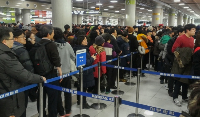 (서울=포커스뉴스) 32년 만에 폭설로 제주국제공항이 폐쇄된지 3일째 되는 25일 오후 제주국제공항 대합실에 모인 관광객들이 항공권을 발권하기 위해 줄을 서 있다. 국토교통부는 25일 오후 12시를 기해 운항을 재개한다고 밝혔다. 하지만 항공기에 쌓인 눈을 제거하는 등 작업들이 남아 있어 실제적인 운항재개는 오후 3시부터 이루어질 전망이다. <사진제공=김세희 사진가>