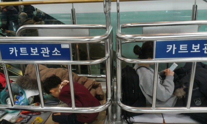 (서울=포커스뉴스) 32년 만에 폭설로 제주국제공항이 폐쇄된지 3일째 되는 25일 오전 제주국제공항 대합실에 모인 관광객들이 운항 재개를 기다리며 카트보관소에 앉아 있다.