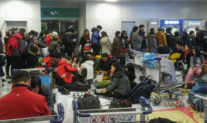 (서울=포커스뉴스) 32년 만에 폭설로 제주국제공항이 폐쇄된지 3일째 되는 25일 오후 제주국제공항 대합실에 모인 관광객들이 항공권을 발권하기 위해 줄을 서 있다.