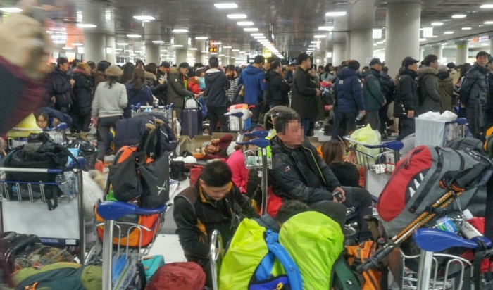 (서울=포커스뉴스) 32년 만에 폭설로 제주국제공항이 폐쇄된지 3일째 되는 25일 오후 제주국제공항 대합실에 모인 관광객들이 항공권을 발권하기 위해 줄을 서 있다.