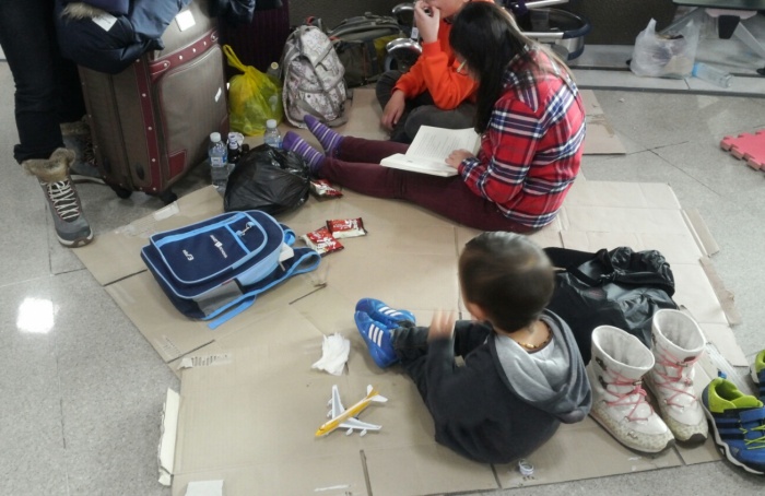 (서울=포커스뉴스) 32년 만에 폭설로 제주국제공항이 폐쇄된지 3일째 되는 25일 오후 제주국제공항 대합실에 모인 관광객들이 항공기 운항 재개를 기다리며 앉아 있다. 국토교통부는 25일 오후 12시를 기해 운항을 재개한다고 밝혔다. 하지만 항공기에 쌓인 눈을 제거하는 등 작업들이 남아 있어 실제적인 운항재개는 오후 3시부터 이루어질 전망이다. <사진제공=김세희 사진가>