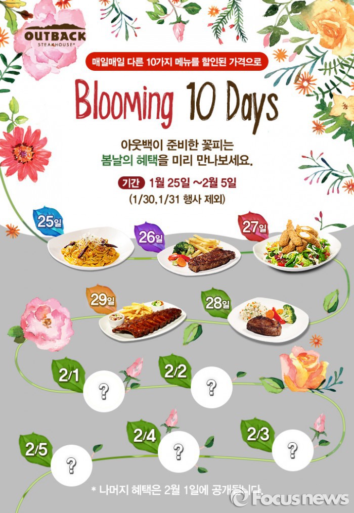 (서울=포커스뉴스) 아웃백 스테이크하우스(이하 아웃백)는 다가오는 봄을 맞아 아웃백 메뉴를 1만원 대에 제공하는 ‘아웃백 블루밍 프로모션’을 오는 2월5일까지 10일간 진행한다.
