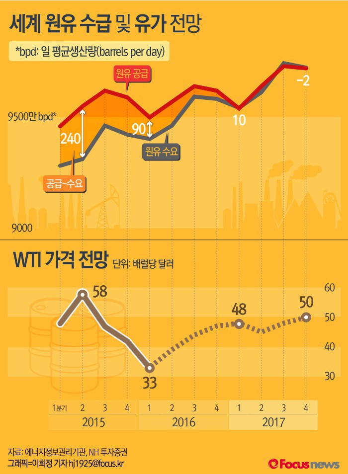 (서울=포커스뉴스) 공급 과잉과 수요둔화로 국제 유가의 끝없는 추락이 이어지면서 향후 유가가 어떤 변화를 나타낼지 관심사다. 국제에너지기구(IEA)에 따르면 세계 원유 공급은 최소 내년까지 현재 수준을 초과할 것이란 전망이다. 원유의 공급과 수요의 균형이 맞춰지면 유가는 안정권에 접어들 것으로 보인다.