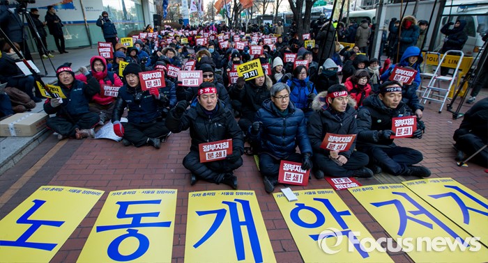 (서울=포커스뉴스) 25일 오후 서울 중구 지방고용노동청 앞에서 열린 '민주노총 수도권 총파업 결의대회'에 참가한 노조원이 구호를 외치고 있다.