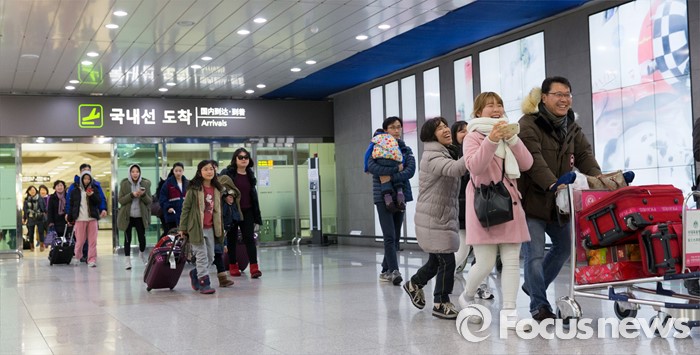 (서울=포커스뉴스) 폭설과 한파로 사흘째 운항이 중단됐던 제주공항에 갇혀있던 탑승객들이 25일 오후 서울 강서구 김포국제공항 국내선으로 입국하고 있다.
