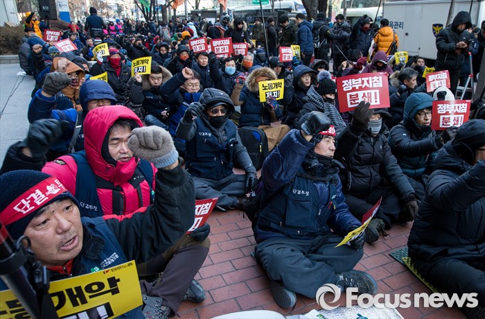 (서울=포커스뉴스) 25일 오후 서울 중구 지방고용노동청 앞에서 열린 '민주노총 수도권 총파업 결의대회'에 참가한 노조원이 구호를 외치고 있다.