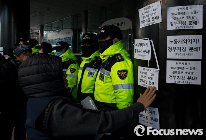(서울=포커스뉴스) 25일 오후 서울 중구 지방고용노동청 앞에서 열린 '민주노총 수도권 총파업 결의대회'에 참가한 노조원이 노동청 벽에 '노동개악저지' 문구가 적힌 스티커를 붙이고 있다.