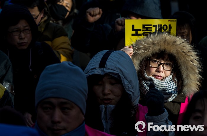 (서울=포커스뉴스) 25일 오후 서울 중구 지방고용노동청 앞에서 열린 '민주노총 수도권 총파업 결의대회'에 참가한 노조원이 구호를 외치고 있다.