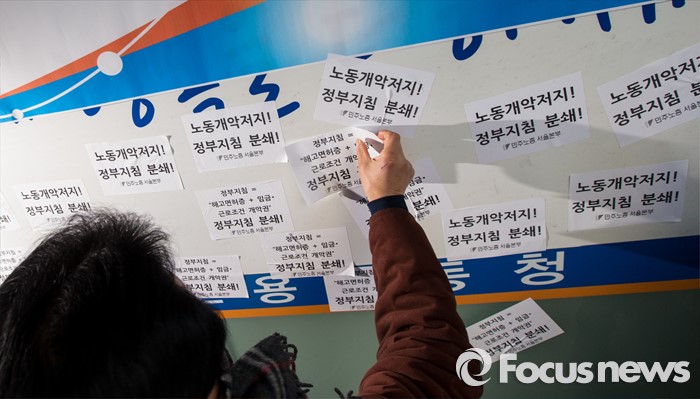 (서울=포커스뉴스) 25일 오후 서울 중구 지방고용노동청 앞에서 열린 '민주노총 수도권 총파업 결의대회'에 참가한 노조원이 노동청 벽에 '노동개악저지' 문구가 적힌 스티커를 붙이고 있다.