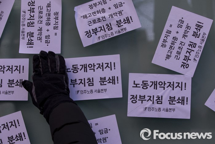 (서울=포커스뉴스) 25일 오후 서울 중구 지방고용노동청 앞에서 열린 '민주노총 수도권 총파업 결의대회'에 참가한 노조원이 노동청 벽에 '노동개악저지' 문구가 적힌 스티커를 붙이고 있다.