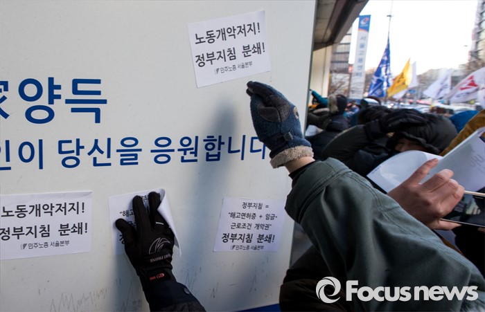 (서울=포커스뉴스) 25일 오후 서울 중구 지방고용노동청 앞에서 열린 '민주노총 수도권 총파업 결의대회'에 참가한 노조원이 노동청 벽에 '노동개악저지' 문구가 적힌 스티커를 붙이고 있다.