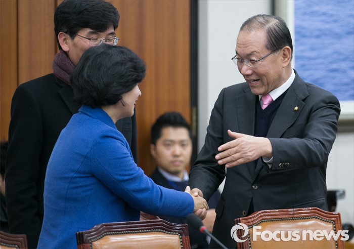 (서울=포커스뉴스) 25일 오후 서울 여의도 국회에서 열린 산업통상자원위원회 전체회의에 앞서 황우여(오른쪽) 새누리당 의원과 야당 의원들이 인사하고 있다.