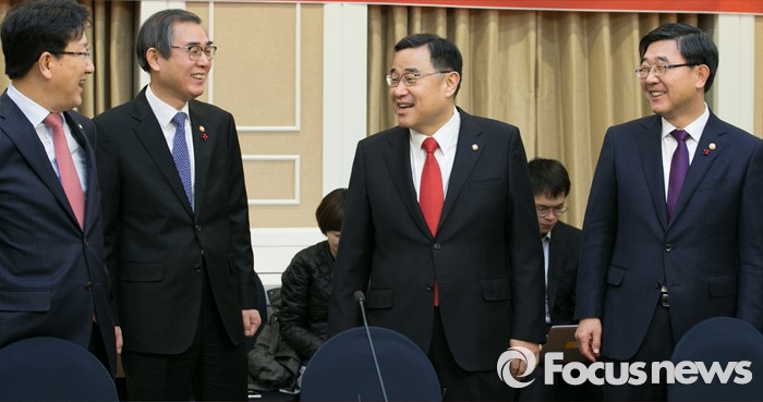 (서울=포커스뉴스) 김정훈(오른쪽 두번째) 새누리당 정책위의장을 비롯한 참석자들이 26일 오전 서울 여의도 국회 귀빈식당에서 열린 '임금 체불 및 하도급대금 부조리 해결' 합동 당정협의에서 대화하고 있다. 왼쪽부터 권성동 의원, 정재찬 공정거래위원장, 김 의장, 이기권 장관.