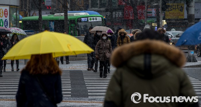 (서울=포커스뉴스) 서울 지역에 눈이 내리고 있는 26일 오전 서울 중구 남대문 일대에서 직장인들이 내리는 눈을 맞으며 출근길을 재촉 하고 있다.
