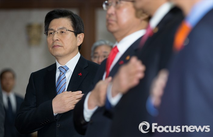 (서울=포커스뉴스) 황교안 국무총리가 26일 오전 서울 종로구 정부서울청사에서 국무회의 전 국기에 대한 경례를 하고 있다.
