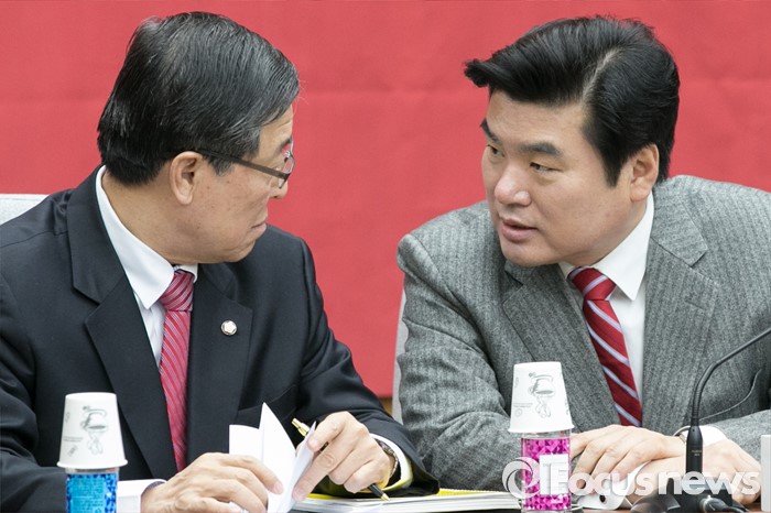 (서울=포커스뉴스) 원유철(오른쪽) 새누리당 원내대표와 황진하 사무총장이 26일 오전 서울 여의도 국회에서 열린 원내대책회의에 참석해 대화하고 있다.
