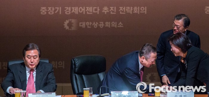 (서울=포커스뉴스) 박용만(왼쪽 두 번쨰) 대한상공회의소 회장과 심상정(오른쪽) 정의당 상임대표가 26일 오전 서울 중구 대한상공회의소 국제회의장에서 열린 '중장기 경제어젠다 추진 전략회의'에 자리해 악수 하고 있다. 이날 회의에 자리한 여야정 대표 및 산학연 대표 70여명은 규제 근본 틀 개선, 기업문화 개선, 국민 행복 위한 서비스 발전 등을 논의 할 예정이다.