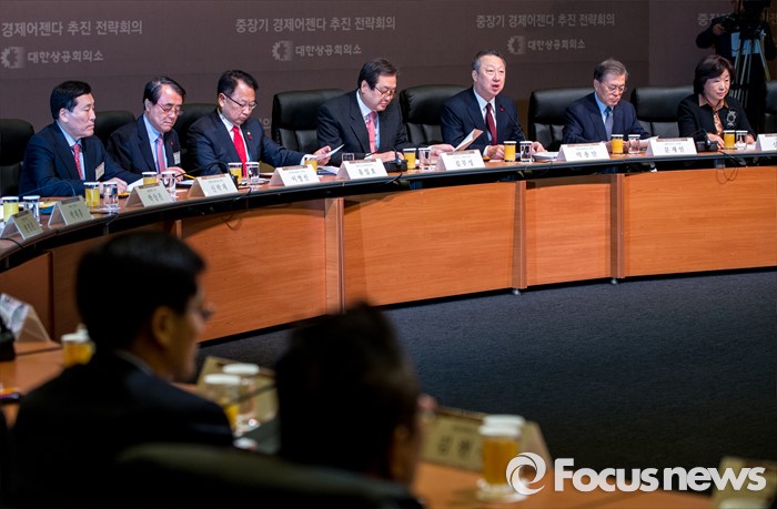 (서울=포커스뉴스) 박용만 대한상공회의소 회장이 26일 오전 서울 중구 대한상공회의소 국제회의장에서 열린 '중장기 경제어젠다 추진 전략회의'에 자리해 모두발언 하고 있다. 이날 회의에 자리한 여야정 대표 및 산학연 대표 70여명은 규제 근본 틀 개선, 기업문화 개선, 국민 행복 위한 서비스 발전 등을 논의 할 예정이다.