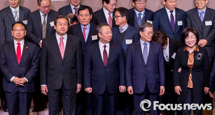 (서울=포커스뉴스) 박용만(왼쪽 세 번째) 대한상공회의소 회장을 비롯한 여야정 대표들이 26일 오전 서울 중구 대한상공회의소 국제회의장에서 열린 '중장기 경제어젠다 추진 전략회의'에 자리해 회의에 앞서 사진촬영을 하고 있다. 이날 회의에 자리한 여야정 대표 및 산학연 대표 70여명은 규제 근본 틀 개선, 기업문화 개선, 국민 행복 위한 서비스 발전 등을 논의 할 예정이다.