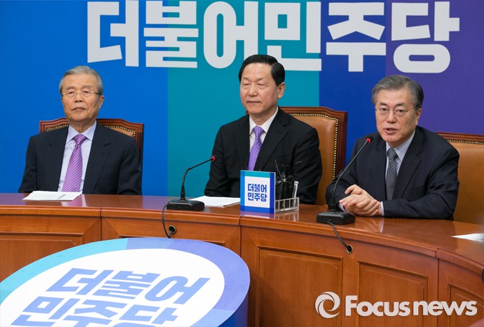 (서울=포커스뉴스) 26일 오전 서울 여의도 국회에서 열린 더불어민주당 인재영입위원회 1차 회의에 참석한 문재인 대표가 모두발언을 하고 있다. 왼쪽부터 김종인 선대위원장, 김상곤 인재영입위원장, 문 대표.