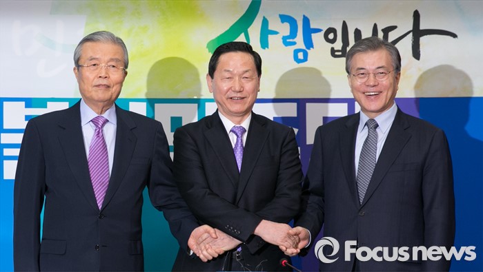 (서울=포커스뉴스) 26일 오전 서울 여의도 국회에서 열린 더불어민주당 인재영입위원회 1차 회의에 참석한 문재인(오른쪽부터) 대표, 김상곤 인재영입위원장, 김종인 선대위원장이 취재진을 향해 포즈를 취하고 있다.