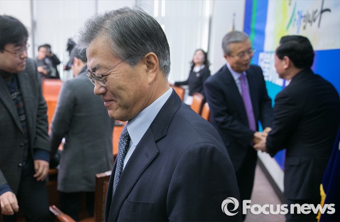 (서울=포커스뉴스) 26일 오전 서울 여의도 국회에서 열린 더불어민주당 인재영입위원회 1차 회의에 참석한 문재인(왼쪽 두번째) 대표가 퇴장하고 있다. 뒤쪽 인사 나누는 이는 김종인(오른쪽 두번째) 선대위원장과 김상곤(오른쪽 첫번째) 인재영입위원장.